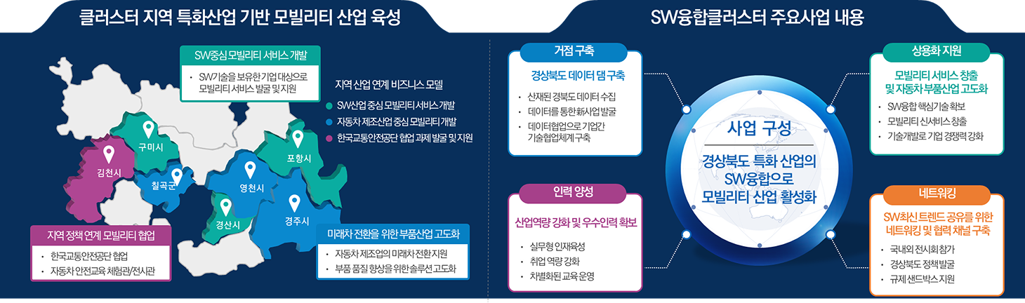 경상북도 7개 시·군 지역 특화산업의 고도화와 新산업 모빌리티 분야의 혁신적인 전환을 위해, 빅데이터 통합 플랫폼을 기반으로 한 데이터 공유·활용 생태계를 구축하고 상생 협력 클러스터를 조성합니다.