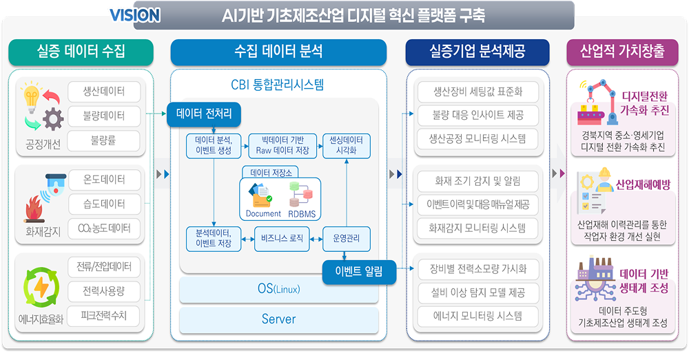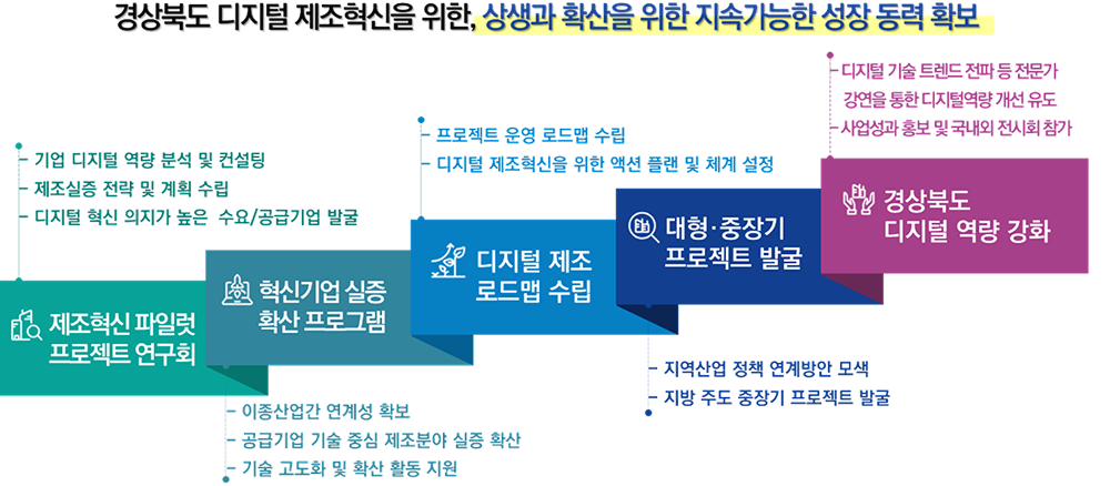 제조혁신을 위해 디지털 제조 실증 프로젝트 운영제조실증 : 철강, 바이오, 반도체, 에너지 등 경북 주력 제조산업기업(수요기업)에 공정별 최적화 솔루션(공급기업)을 개발하여 적용 및 확산